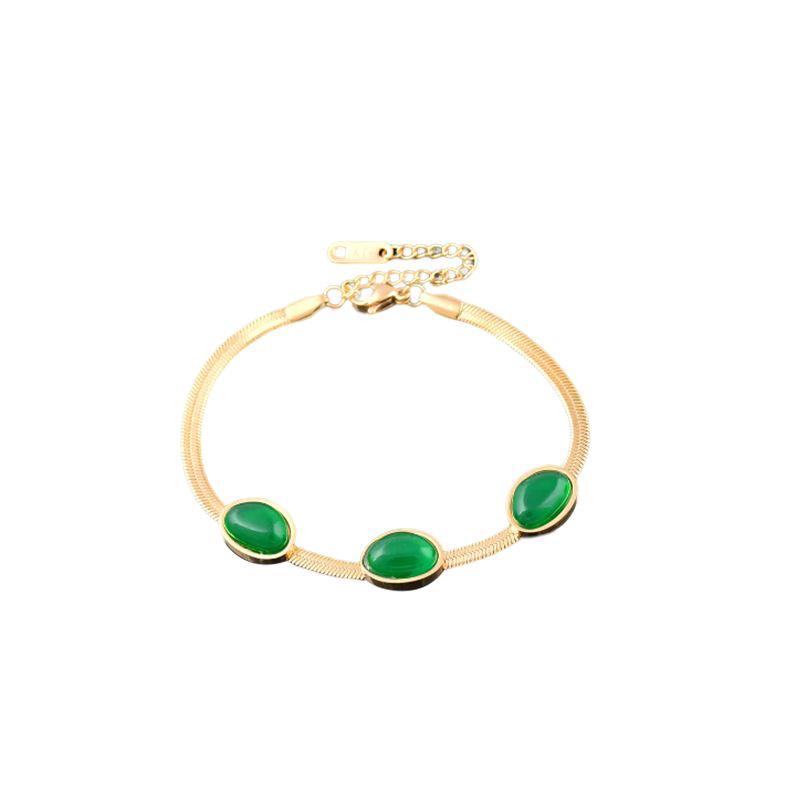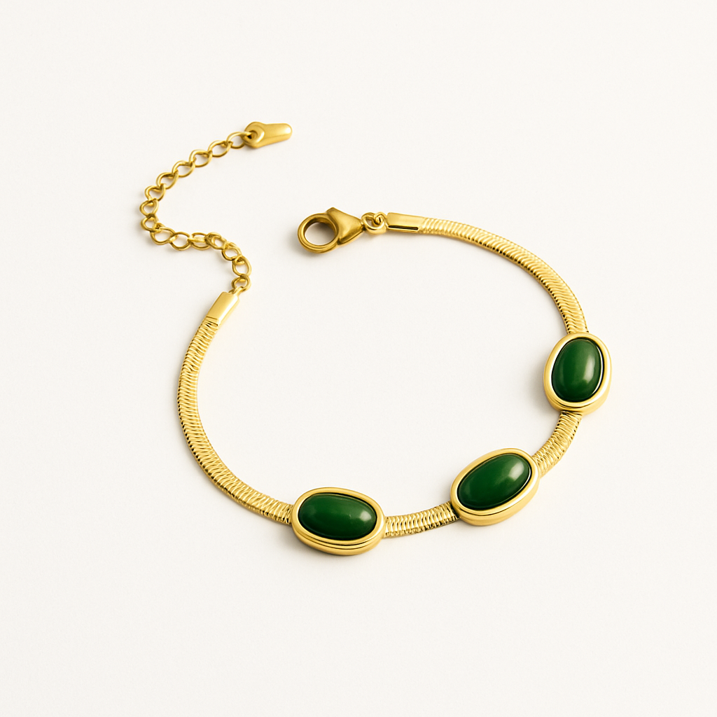 Combining natural elegance with exquisite luxury, the Emerald Grace bracelet features three vibrant green oval stones nestled in polished gold-plated bezels, linked by a smooth snake chain. This design effortlessly merges contemporary sophistication with enduring style, making it an ideal accessory for both daily wear and special moments.